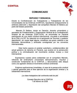 Argentina. La Confederación de Trabajadoras y Trabajadores de las Universidades de las Américas (CONTUA), emitió un enérgico comunicado en el que repudia y denuncia la detención y posterior deportación arbitraria del dirigente sindical Marcelo Di Stefano, ocurrida en el aeropuerto internacional de Tocumen por disposiciones del Estado de Panamá.