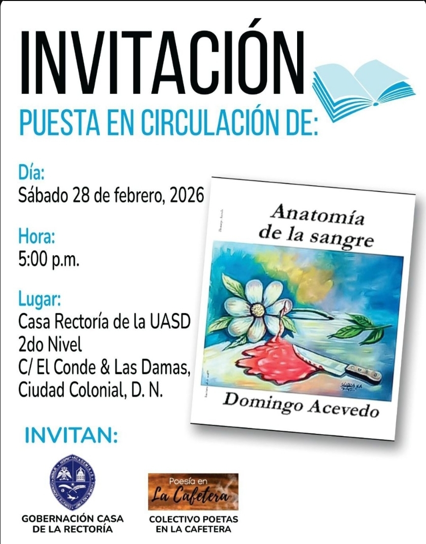 La puesta en circulación de Anatomía de la sangre, es un acto literario: una celebración de la palabra como memoria, herida y belleza. El nuevo poemario del escritor Domingo Acevedo nos convoca a un encuentro íntimo con la poesía que nace del pulso humano, de la sensibilidad que observa la vida con hondura y la nombra sin concesiones.