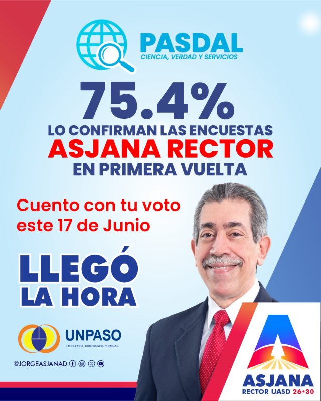 Santo Domingo. La más reciente encuesta de la firma PASDAL, correspondiente a marzo de 2026, dibuja un escenario de alta concentración electoral en la Universidad Autónoma de Santo Domingo (UASD). El estudio sitúa al doctor Jorge Asjana David con un 75,4% de intención de voto en la carrera por la rectoría, una ventaja que, de sostenerse, le permitiría imponerse en primera vuelta.
