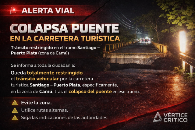 El tránsito vehicular fue totalmente restringido en la carretera turística Santiago–Puerto Plata, específicamente en la zona de Camú, tras el colapso de un puente en ese tramo. La situación ha generado interrupciones en la circulación y preocupación entre los conductores que utilizan esta vía estratégica. Las autoridades exhortaron a la ciudadanía a evitar la zona, utilizar rutas alternas y mantenerse atentos a las orientaciones oficiales mientras se evalúan los daños y se establecen medidas de respuesta.