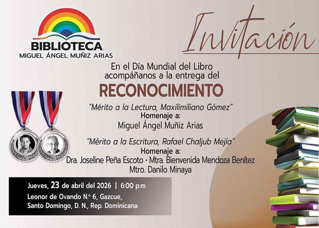 El acto de reconocimiento se celebrará hoy jueves 23 de abril de 2026, a las 6:00 de la tarde, Biblioteca Miguel Ángel Muñiz Arias, ubicada en la calle Leonor de Ovando No. 8, sector Gazcue, en Santo Domingo, Distrito Nacional.